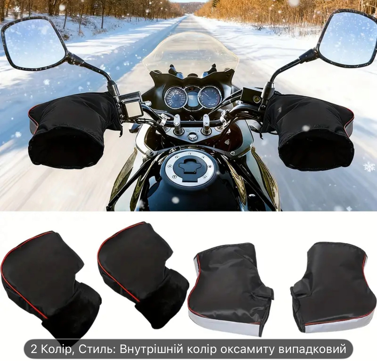 У наявності, дуже чудово сядуть на будь-яке кермо мото, вело техніки. Водонепроникні, вітропроникні! Всередині штучне хутро. Чудово підійдуть для тих, хто не закінчує сезон покатух навіть у зимову пору!